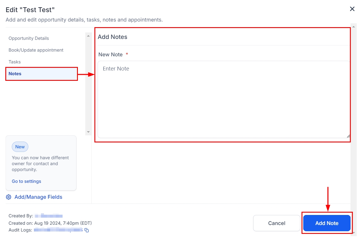 You can view or edit notes in the notes tab. Here you can add important details related to the opportunity in your pipeline. These notes will show in the Opportunity Card as well as in the contact details within the contacts tab.
