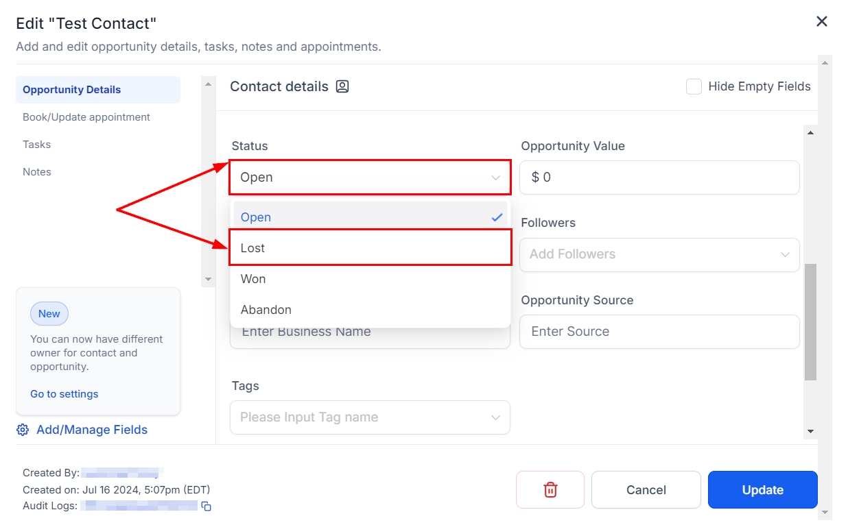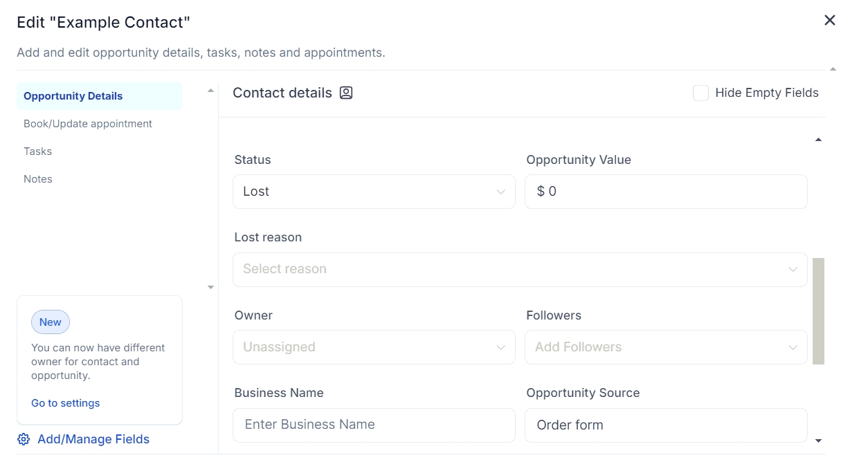 If the available reasons do not accurately reflect your situation, you can easily add a new reason in the Lost Reason field.