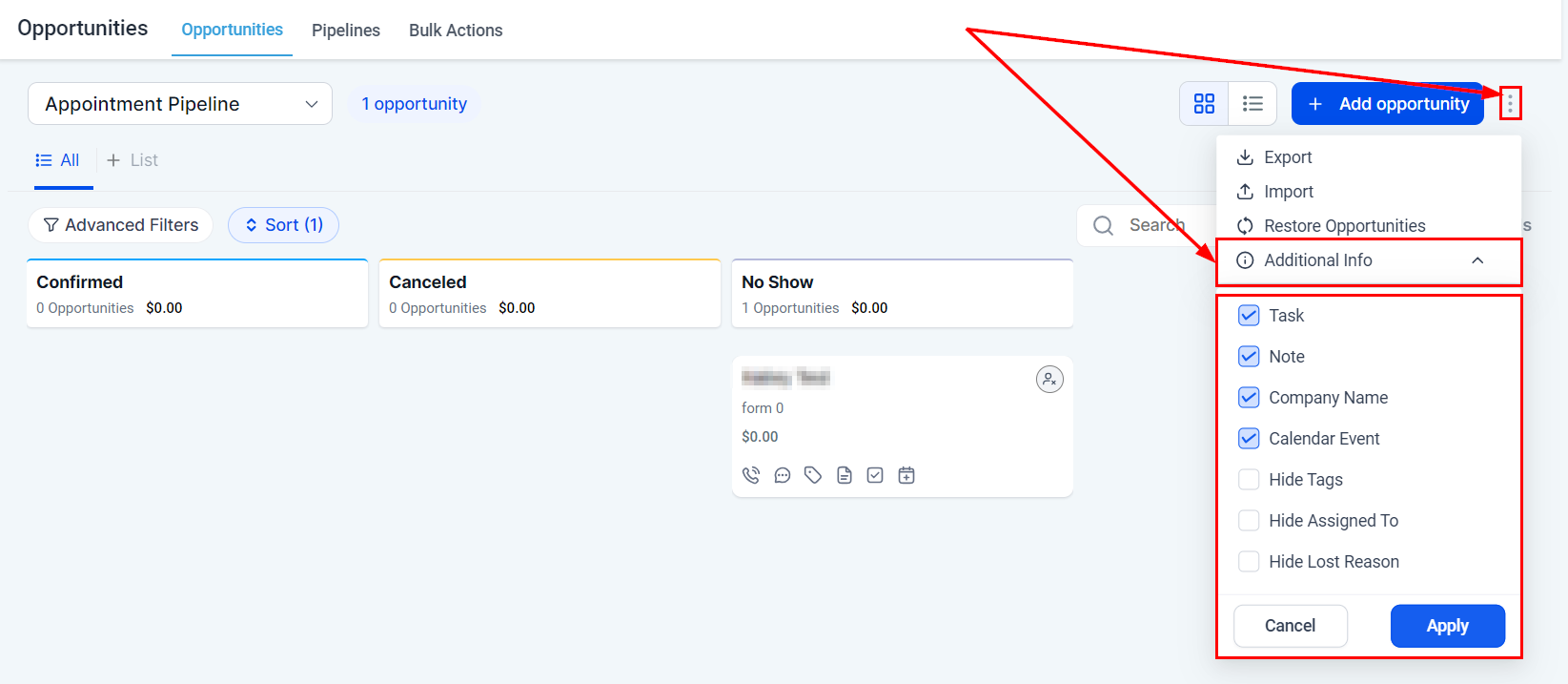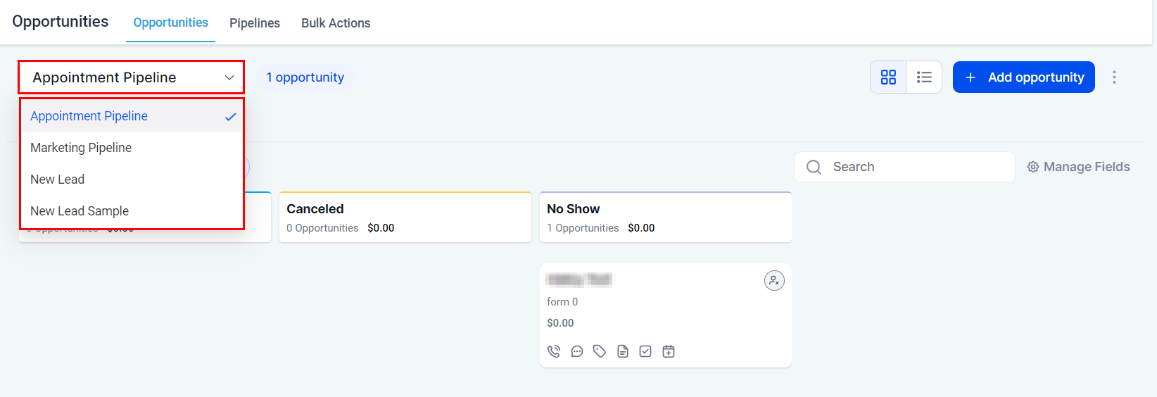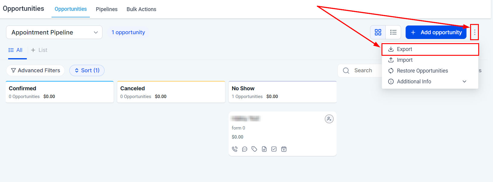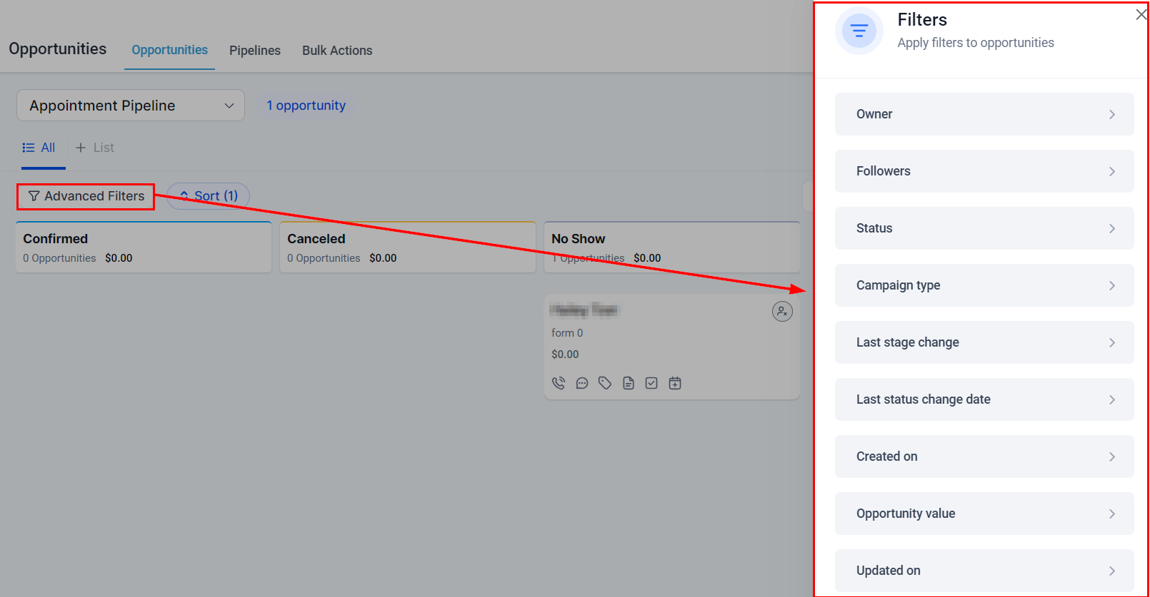 You can filter your opportunities by pipelines, allowing for a more targeted and efficient analysis of your sales pipeline's progress and effectiveness.