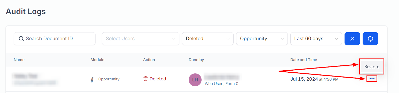 By selecting "Restore Opportunities," you can open the audit logs with deleted opportunities filtered, enabling you to quickly identify and restore any deleted opportunities.