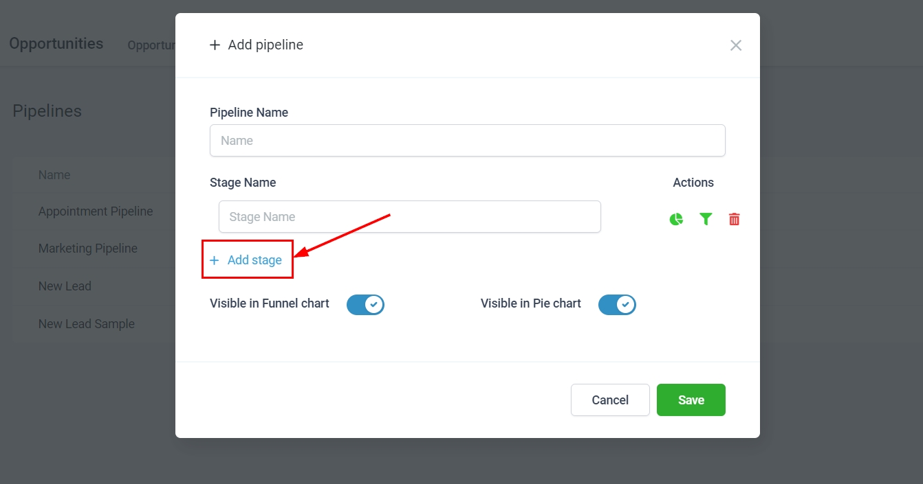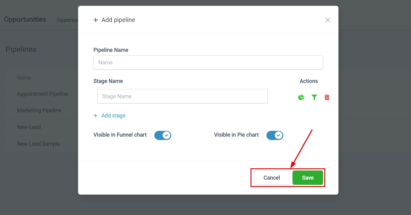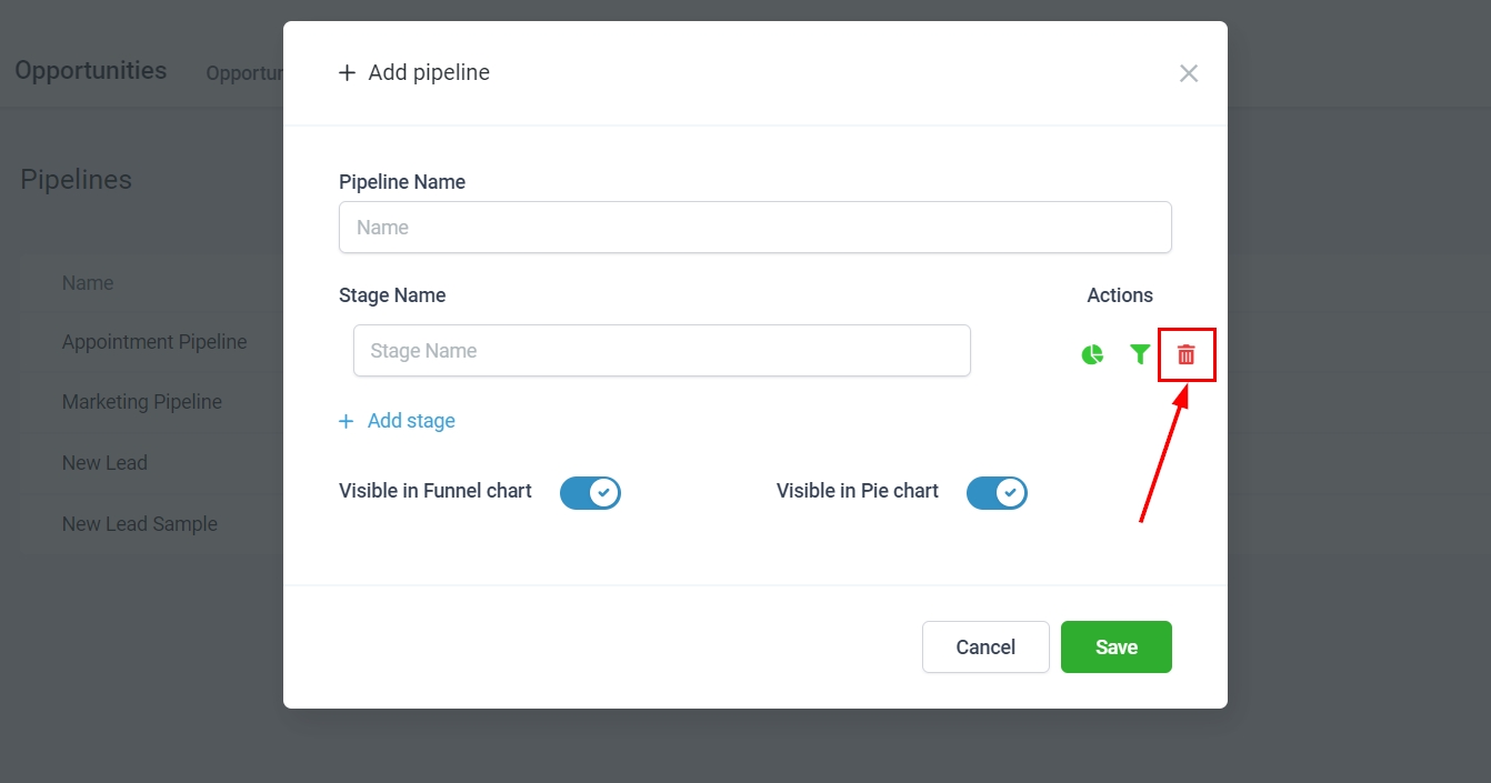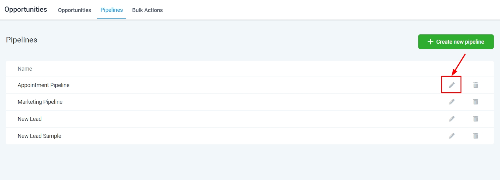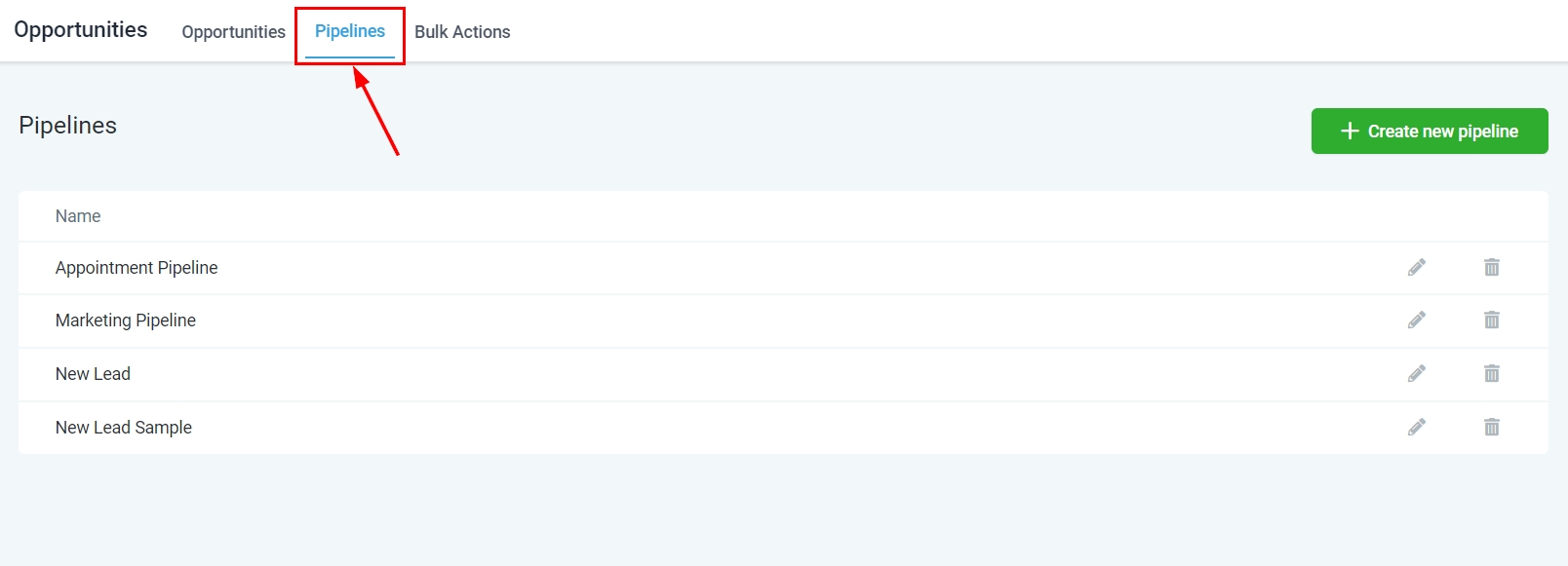 Access the Pipelines section from the Opportunities tab. Here, you can create, modify, and delete pipelines as needed.