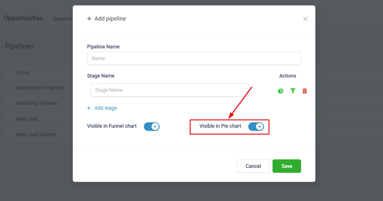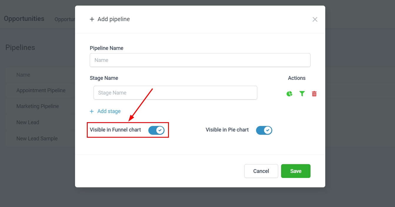 Toggle this option to display or hide the pipeline in your dashboard funnel charts.