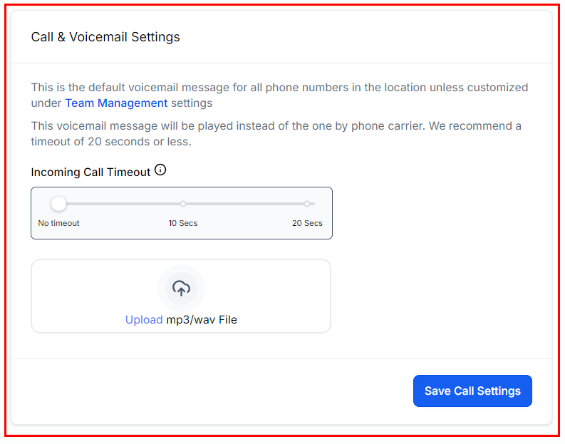 You can upload a custom voicemail in MP3/WAV format and set a timeout duration. A timeout of 20 seconds or less is recommended. The voicemail uploaded in this section serves as the default voicemail message for all numbers within your account unless modified under the Team Management settings. This message will override the carrier’s default voicemail and will be recorded by the CRM if a call remains unanswered within the specified time frame.