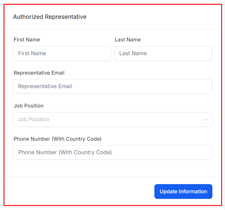 To designate an Authorized Representative in your system, input the individual's first and last name, email address, job position within your company, and phone number, including the country code.
