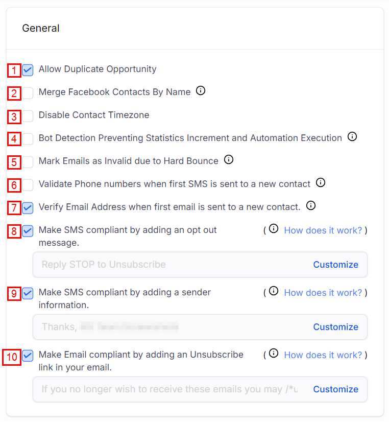 Make SMS compliant by adding an opt-out message: If activated, your configured opt-out message will be automatically included in the first SMS sent via Bulk Messages to ensure compliance and improve delivery rates. You can customize this message by clicking the "Customize" button.
