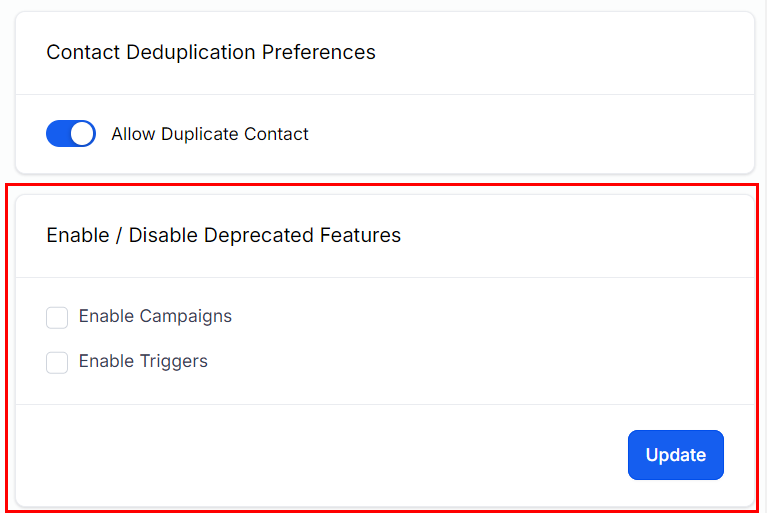Enable or disable features that have been phased out within this section. Currently, the features available in this list are Campaigns and Triggers since they have been replaced by Workflows.