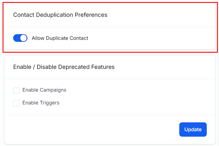 This setting controls how your account handles duplicate contacts. To allow duplicate contacts, toggle this setting to the on position. To disallow duplicate contacts, toggle it to the off position.