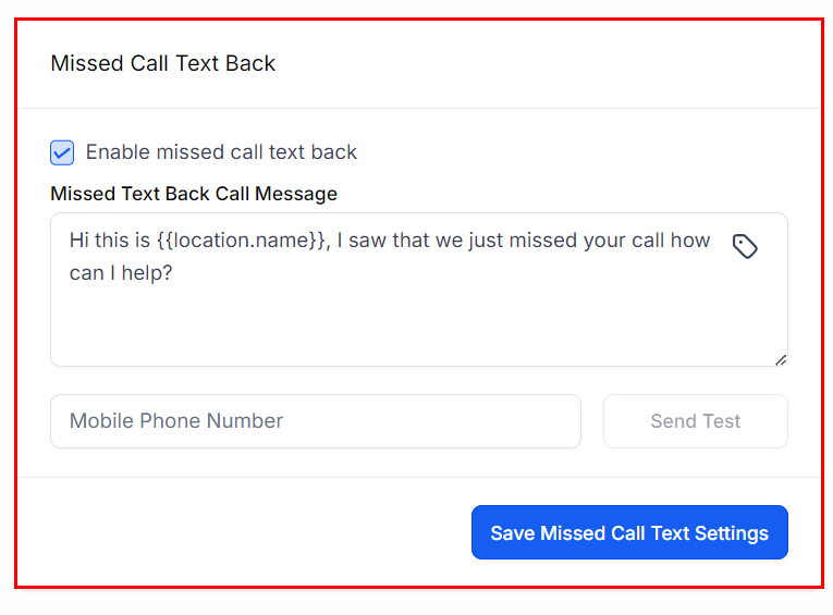 The Missed Call Text Back feature automatically sends an SMS message to callers who are unable to reach your team if enabled. You can configure the content of this SMS, including the option to add Custom Fields and Custom Values. To test the SMS message you’ve configured, enter your phone number in the input field provided and click "Send Test."