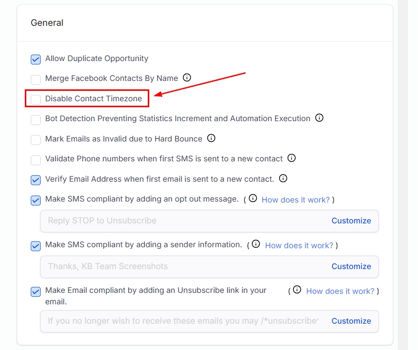 Locate the "Disable Contact Timezone" checkbox.