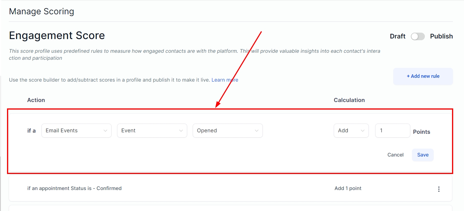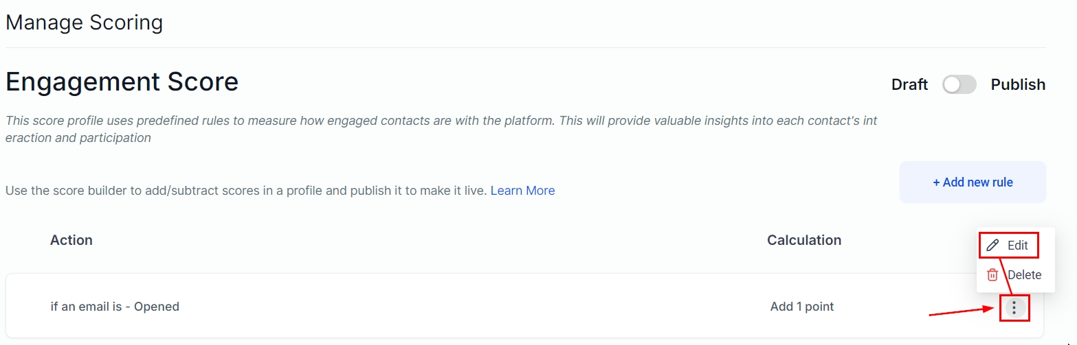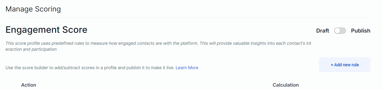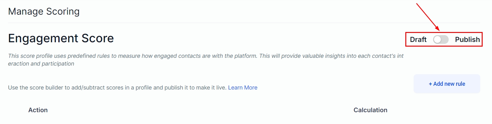 By default, the score profile is in a draft state. However, once it is published, the score will be reflected for all the contacts. Publishing the score profile makes it active and applicable to all contacts or leads.