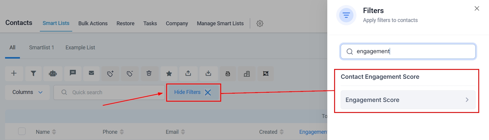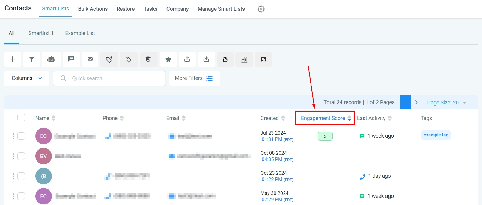 Users have the option to sort contacts based on their engagement scores. Sorting contacts this way helps prioritize high-priority leads and identifies contacts that may require more nurturing or follow-up.
