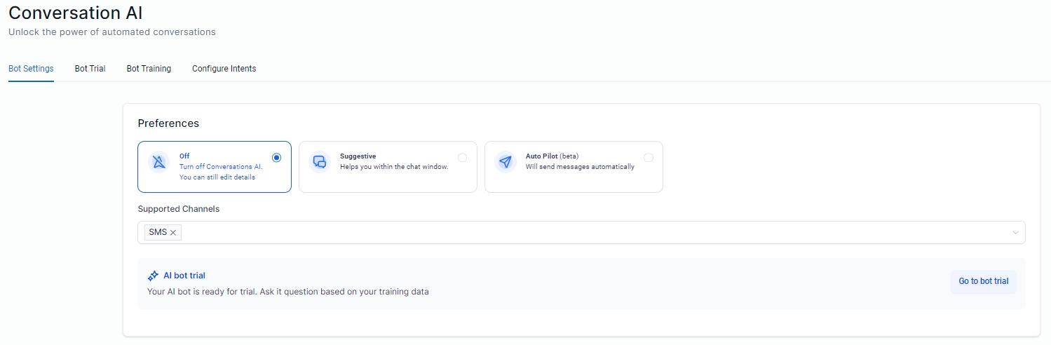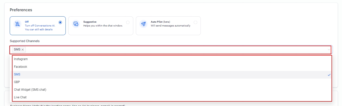 The "Supported Channels" section allows you to pick the platforms on which Conversation AI will operate. Here are the currently supported channels: