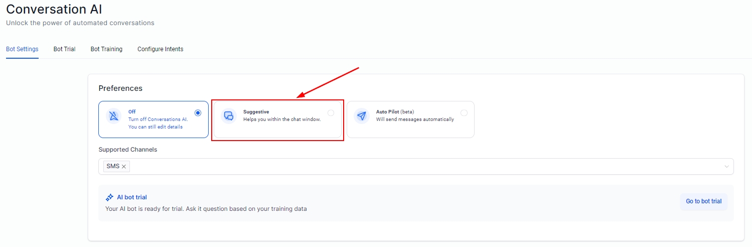 In this mode, Conversation AI serves as a helpful tool within the chat interface by offering potential responses to customer queries. You have the option to send these suggestions as they are, make changes before dispatching them, or bypass the suggestions altogether.