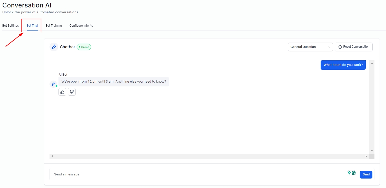 Here you can take the Bot for a spin, and interact with it to get a feeling of how it will interact with your customers. Here you can write a message and get a response back from your bot, if you don't like the way it answers click on the thumbs down to change how the bot will respond in the future.
