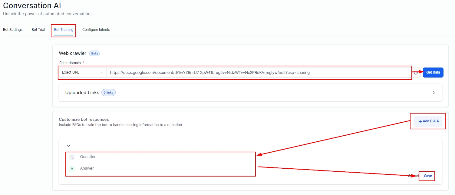 In the "Customize Bot Responses" area, you can utilize the "+ Add Q & A" button to include commonly asked questions (FAQs) and their answers. This helps in educating the bot to manage inquiries efficiently.