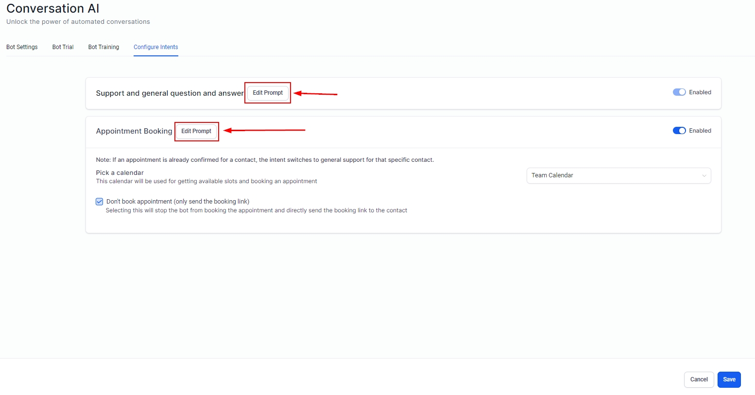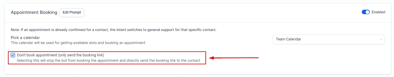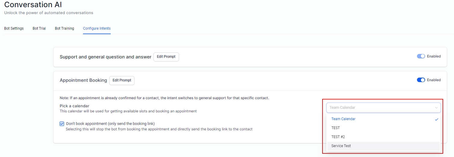 In the "Appointment Booking" segment, you are prompted to choose a calendar from your CRM. Selecting a particular calendar automatically earmarks the corresponding scheduling link. This link is subsequently utilized in the bot's responses, allowing customers to schedule appointments. This facilitates smooth integration of your CRM's scheduling functionalities with the automated customer engagement of the Conversation AI.