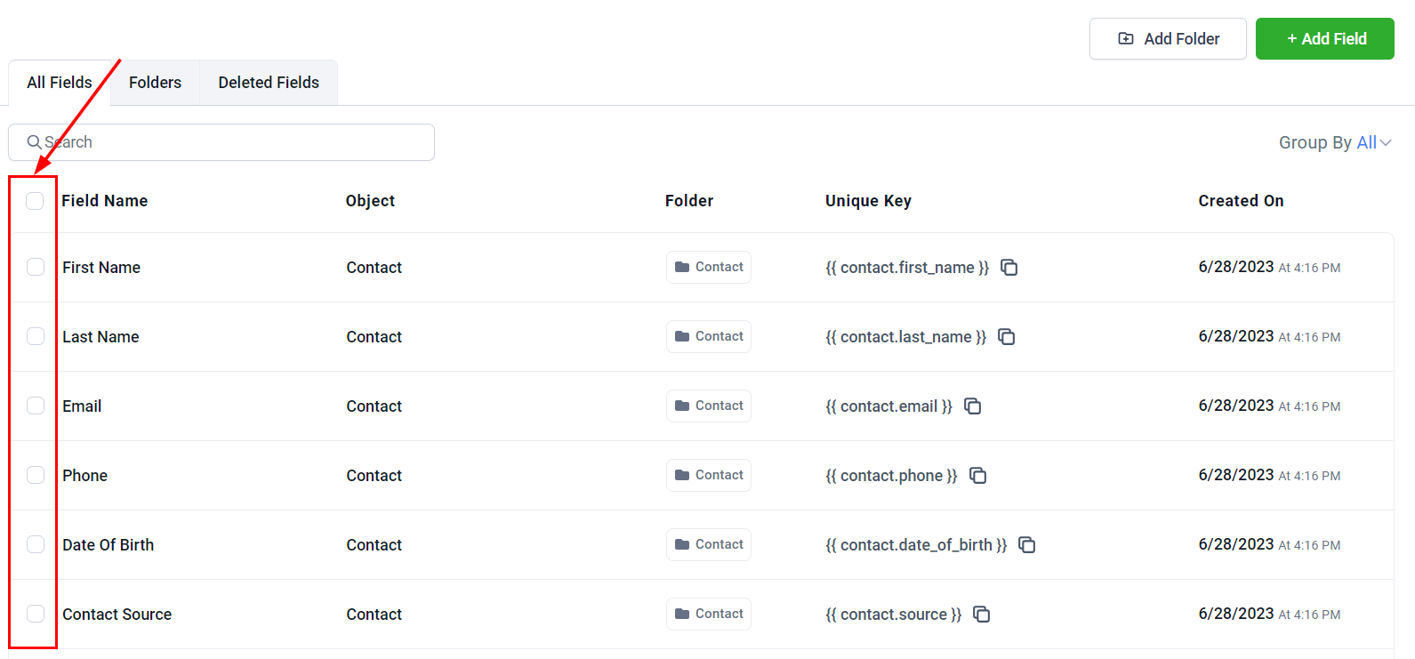 The checkboxes give you the power to perform different actions. You can select just one custom field or multiple fields, depending on the action you want to perform.