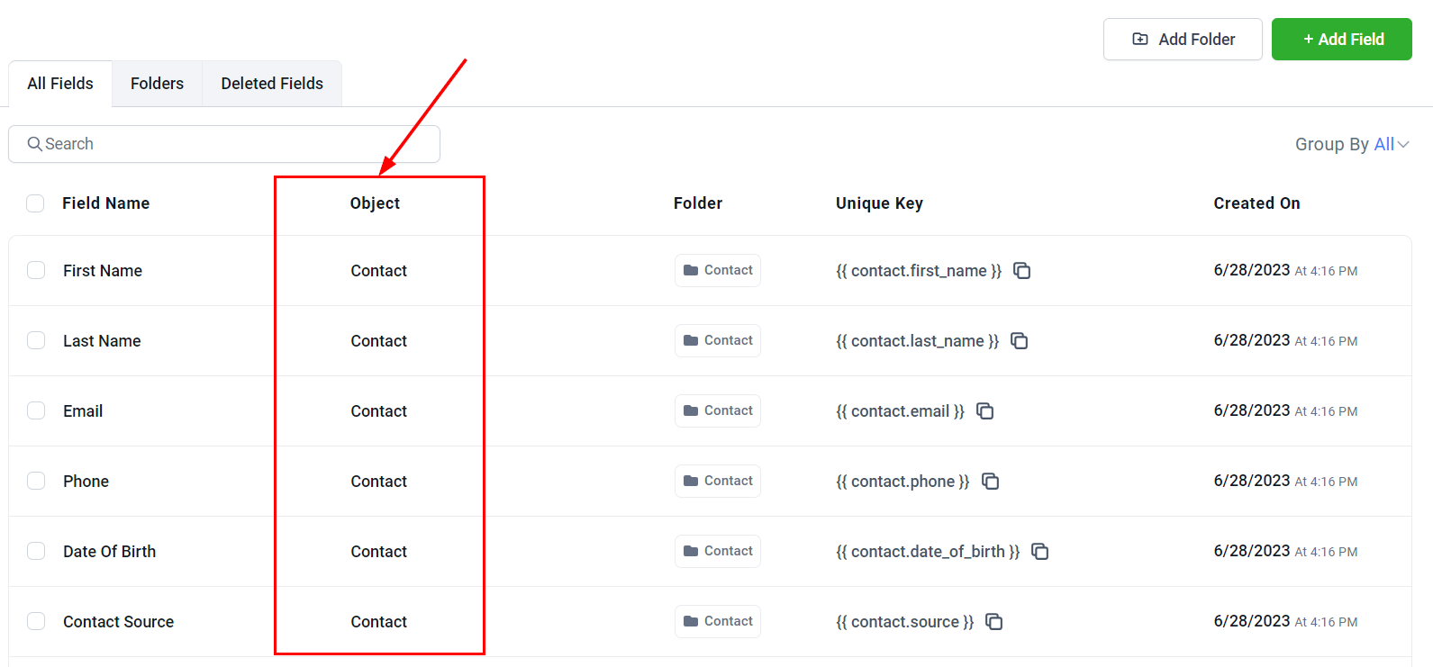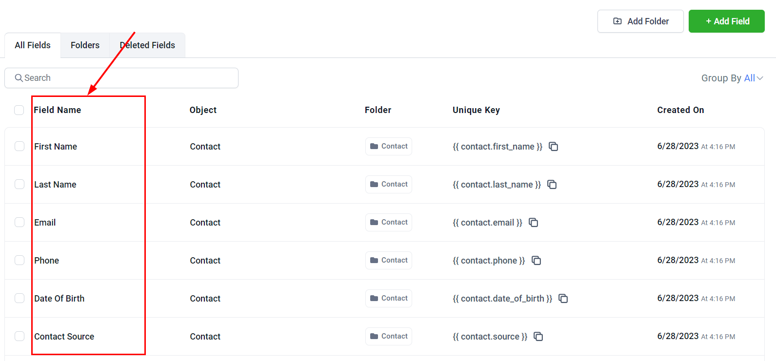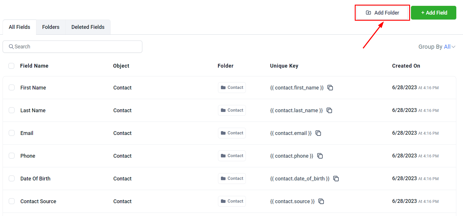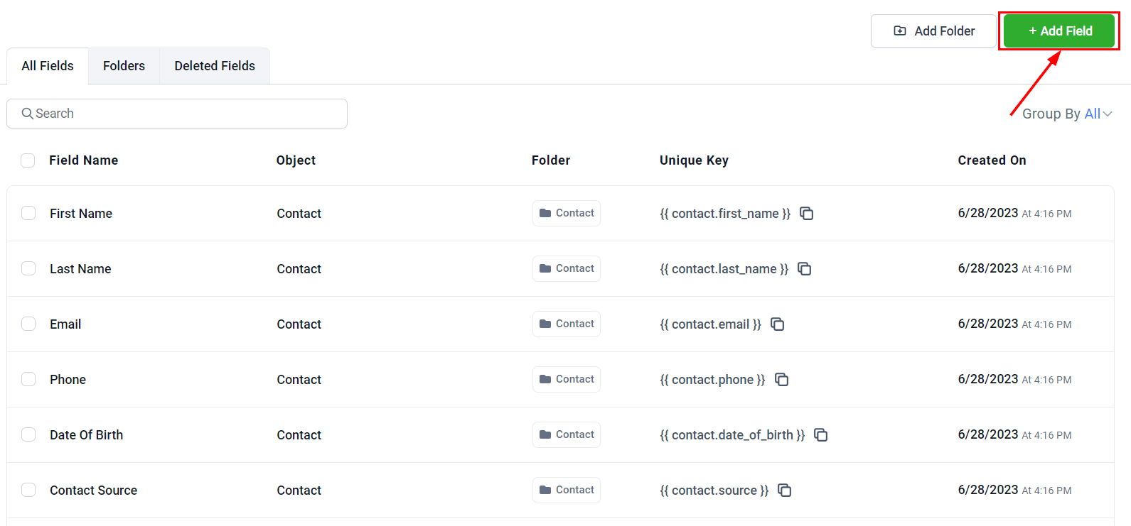 To create a custom field, locate and click the green "Add Field" button at the top right of the screen. A popup will appear, allowing you to enter all the necessary details to add your custom field.