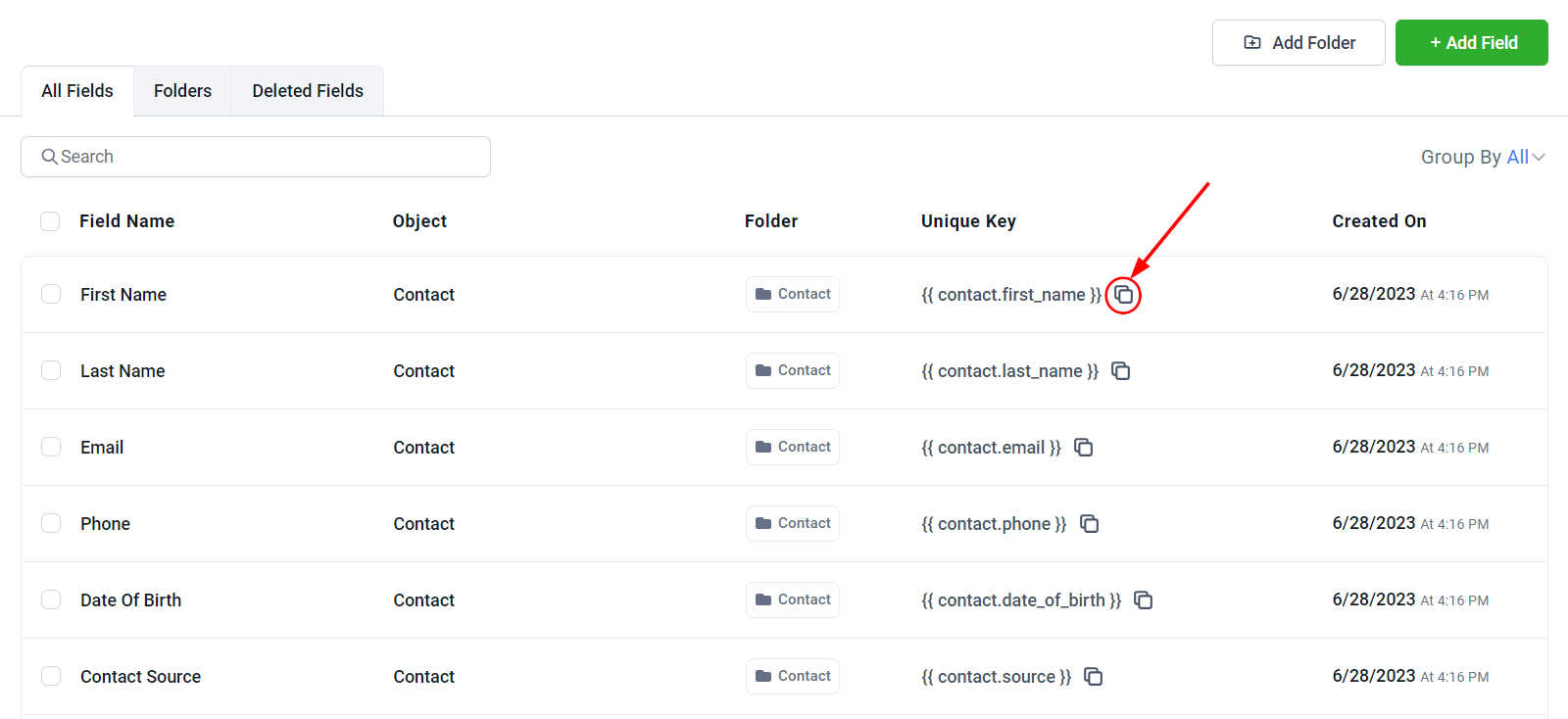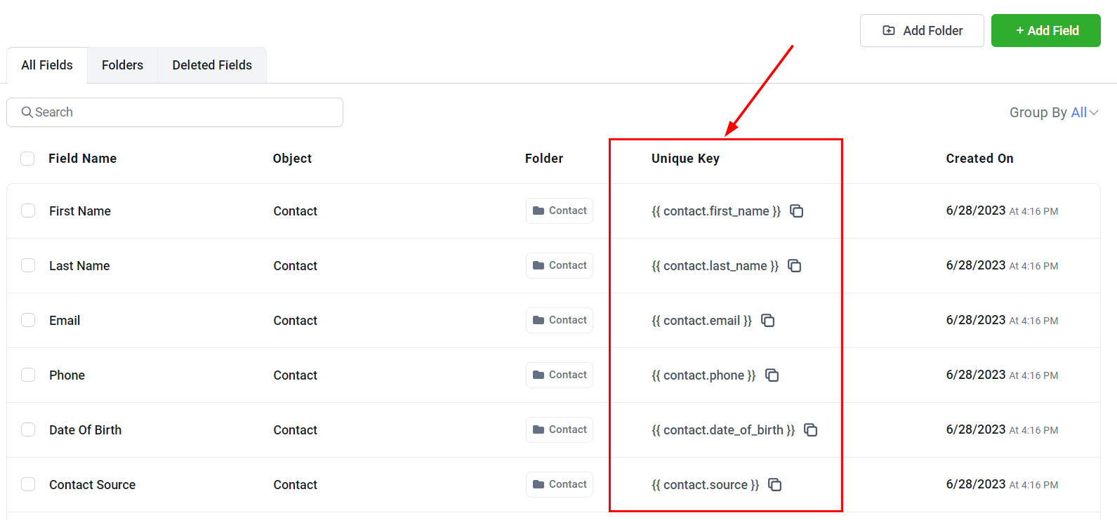 The Unique Key serves as an identifier when obtaining data through webhooks or incorporating custom information into communication channels such as emails and text messages. This key is generated automatically, taking the format based on the name assigned to your custom field, ensuring a seamless integration process.