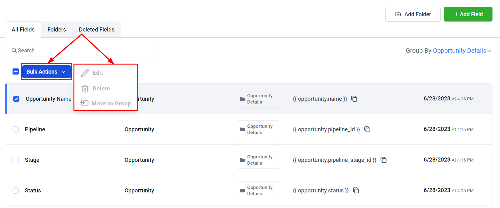 Move to Group: Use this option to transfer the selected custom fields to a different group, organizing them as needed.
