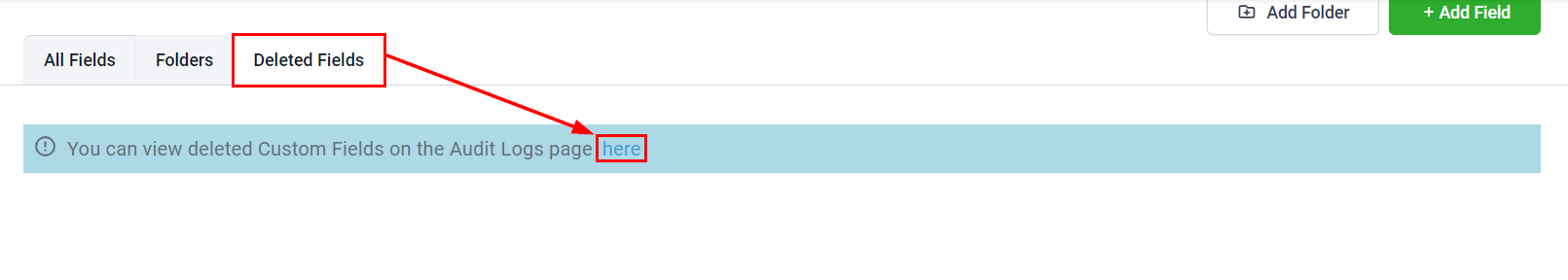 In the Deleted Fields tab, you will be able to view the custom fields that have been previously deleted. Clicking on the redirect link will take you to the audit page in your CRM where you can view items previously deleted.