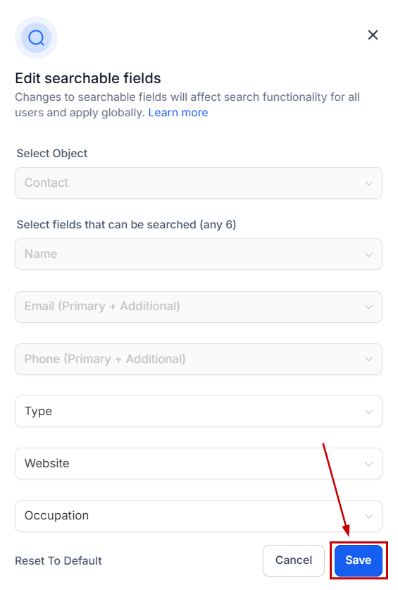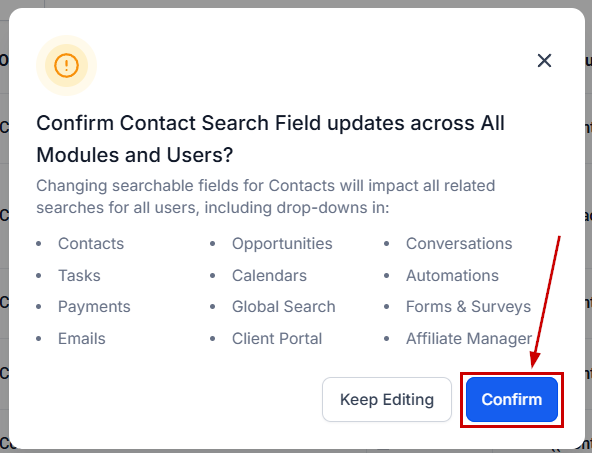 Click Confirm on the next step to change the searchable fields across the CRM.
