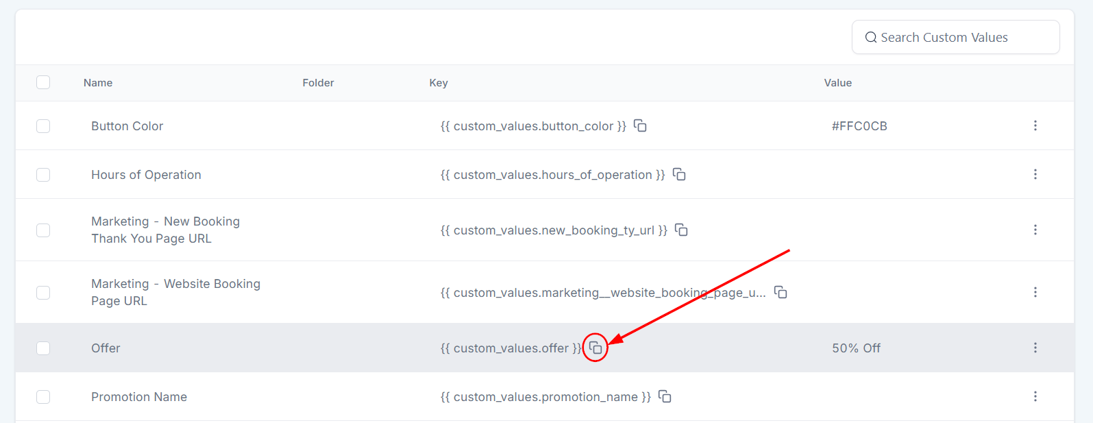 Copy the custom value by pressing the copy icon associated with the value.