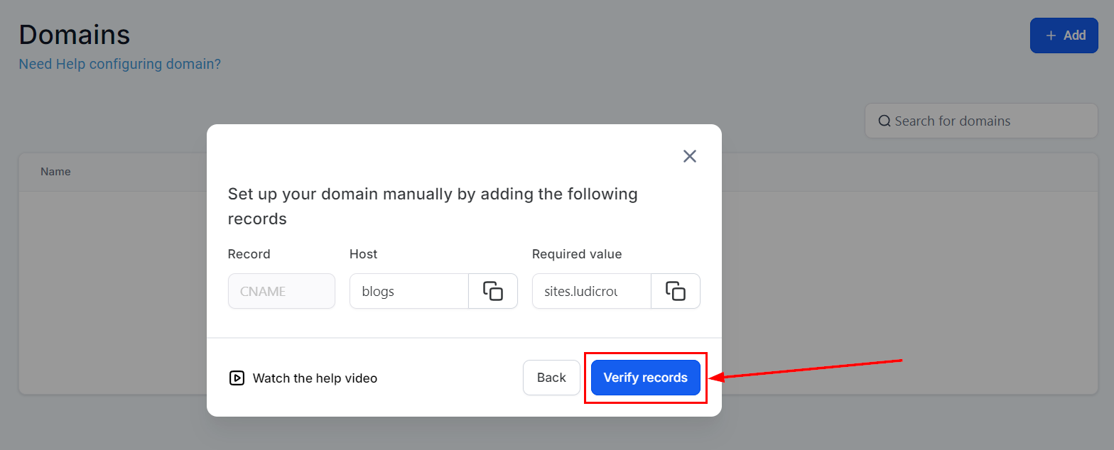 Add New Domain: Enter the full subdomain URL (e.g., "blogs.example.com") and click "Continue".