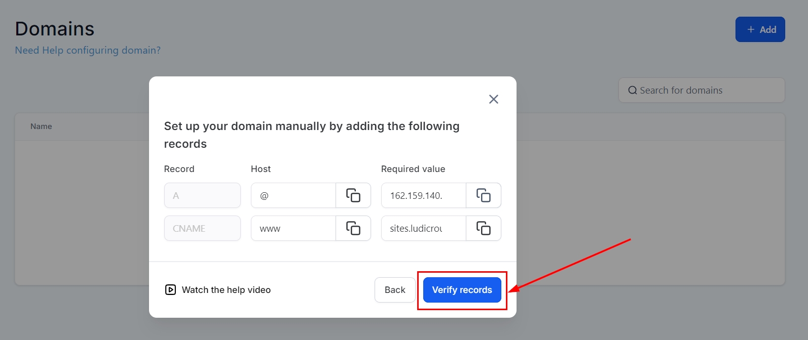 If no A record exists, create a new one by clicking Add, selecting "A" as the record type, using "@" as the host for the root domain, and entering “162.159.140.166” in the "Points To" field. Otherwise, select “CNAME” as the record type, using “www” as the host for the root domain, and enter “sites.ludicrous.cloud” in the “Points To” field.