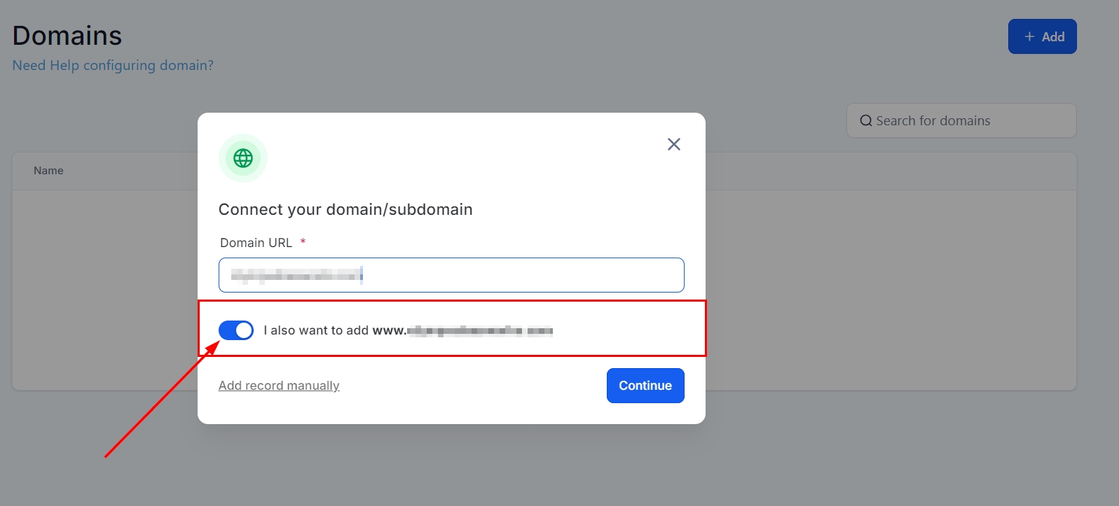 Since this is a root domain, you also have the option to add the "www" subdomain by toggling the option.
