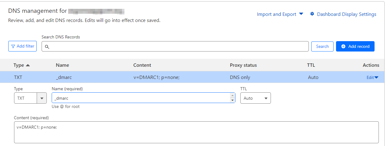 If not, create a TXT DNS record via your DNS hosting provider. Set the Host/Name value as "_DMARC" and use the content: "v=DMARC1; p=none;". Google recommends gradually tightening your DMARC policy, as outlined in their DMARC Rollout Tutorial.