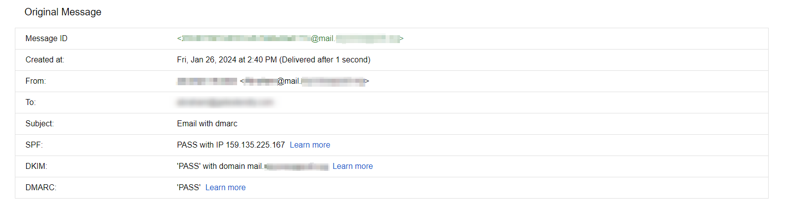 In Gmail, you can inspect the header of an email by clicking the three-dots icon and selecting the "Show More" option. Here's what the header will look like for an email that was sent from a domain that has a valid DMARC record in place: