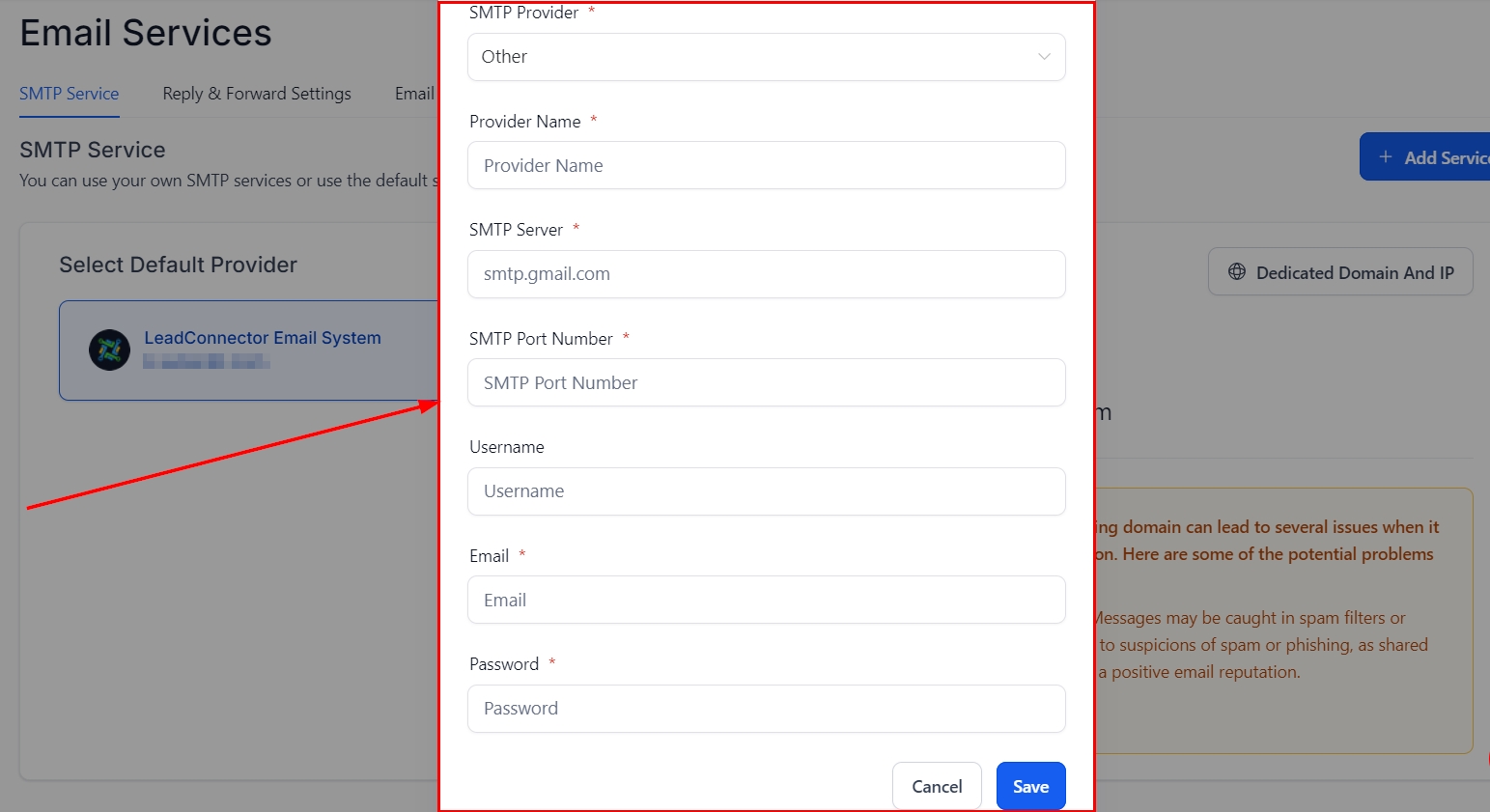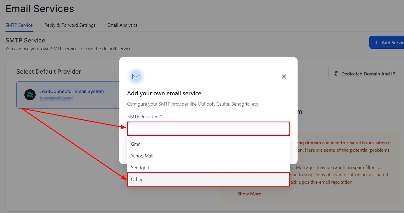 Configure SMTP in the CRM: In the CRM, go to "Settings", find "Email Services", and click "Add Service".
