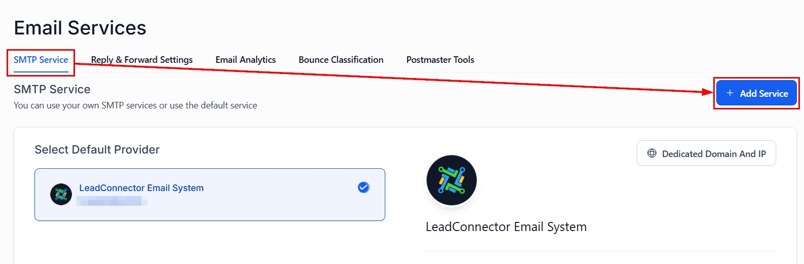 Access the Settings area within your account, and locate the Email Services section. From there, click on the Add Service button to begin the SMTP connection process.