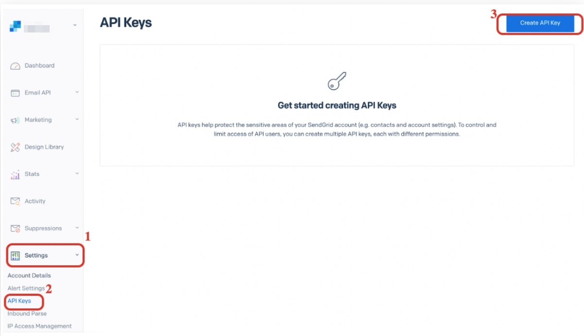 Before integrating SendGrid with your account, you will need to create an API Key. To do this, log in to your SendGrid account, navigate to "Settings" on the left navigation bar, and then select "API Keys". Click on the “Create API Key” to generate a key.
