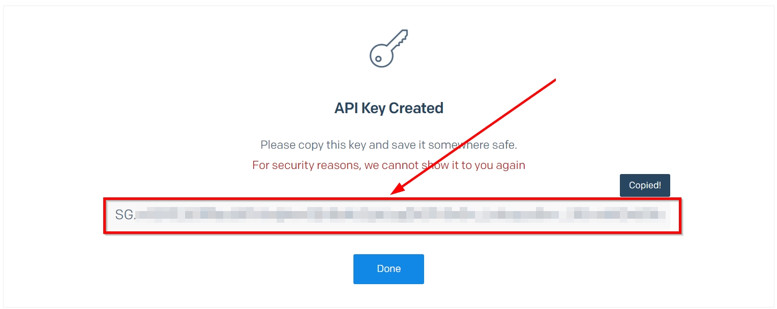 The API key will serve as the password for the SendGrid connection. Click on the key to automatically copy it in full and ensure you store it securely. For security purposes, avoid embedding the API key directly in your code or storing it in any public repository.