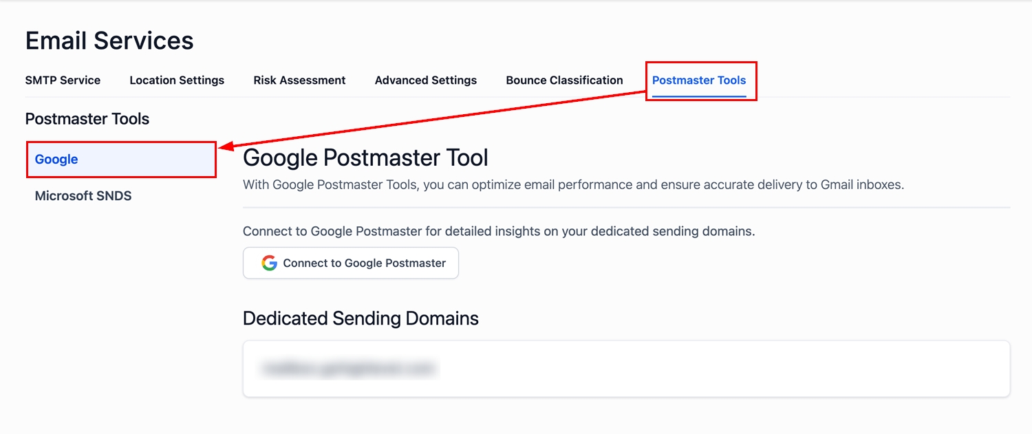 Go to Settings > Email Service > Postmaster Tools > Google Postmaster Tool to begin linking Google Postmaster with your account.