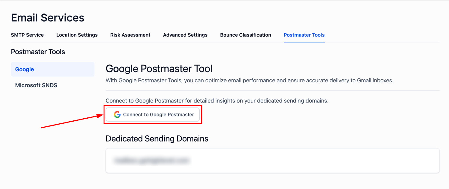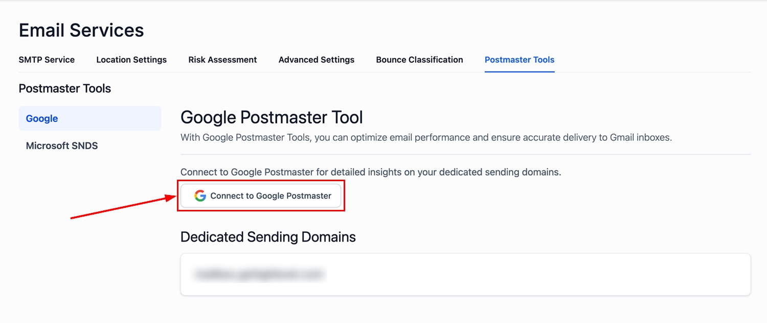 Click on “Connect to Google Postmaster” to sync your account with Google Postmaster Tools.