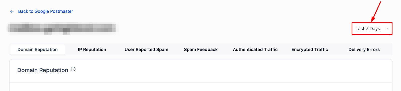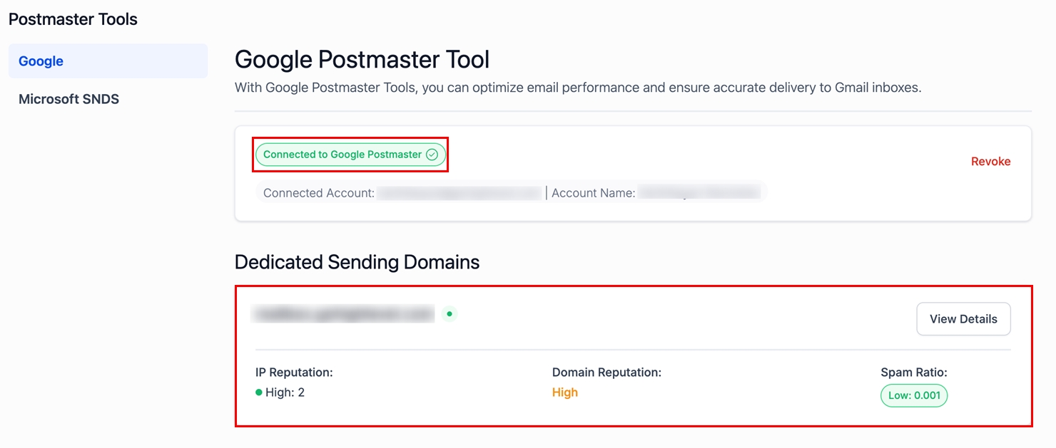 Once connected, your Postmaster metrics will seamlessly integrate into the platform for efficient management. You can view essential details about your dedicated sending domains, including IP and domain reputation, as well as the spam complaint ratio.