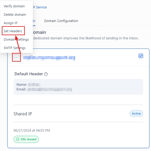 This will take you to a view with Dedicated domain and Domain Configuration. The Dedicated Domain tab will be shown by default, here you'll find all the email-dedicated subdomains you've connected and by clicking the three dots icon of any domain you can access its setting. Included in those settings you can add the default name and email address.