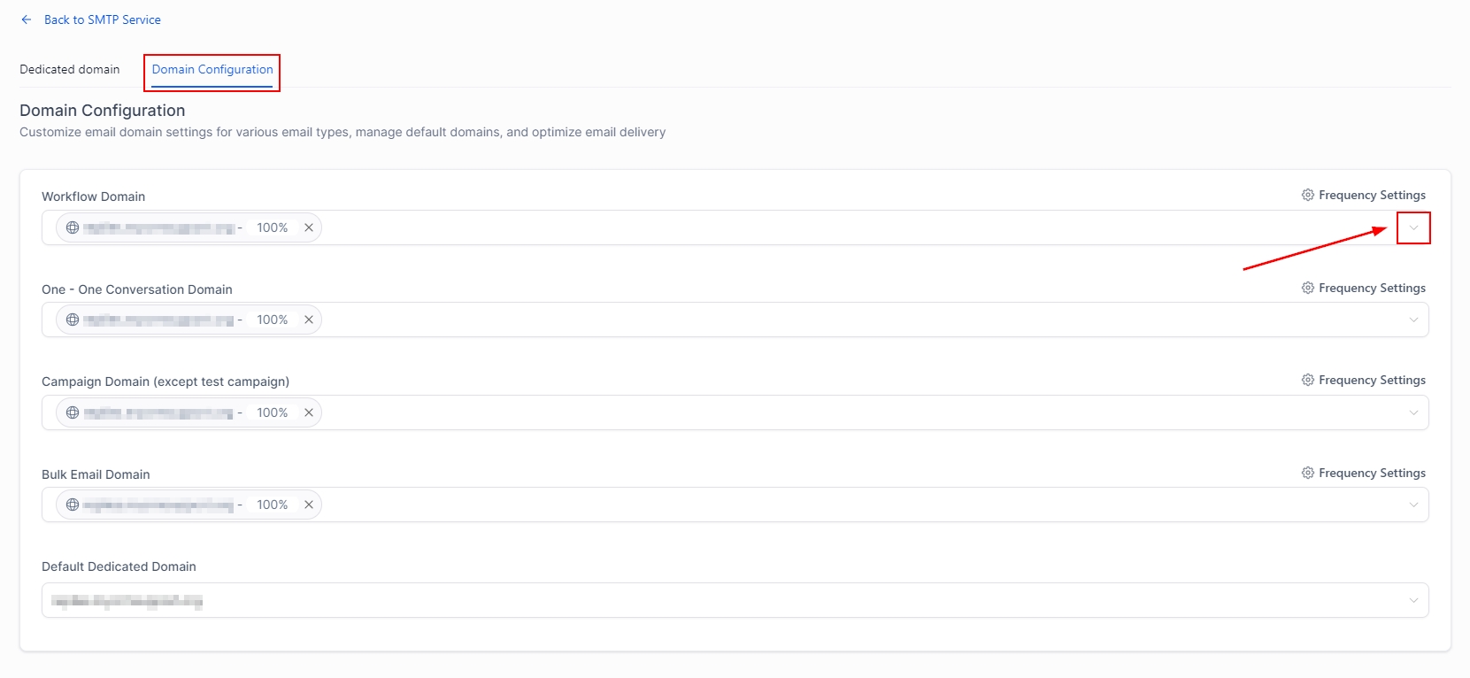 Switch over to the Domain Configuration, here you can configure the domain you'd like to use for specific actions such as campaigns and workflows. To do so, click the downwards pointing arrow to open the drop-down menu and select the domains.