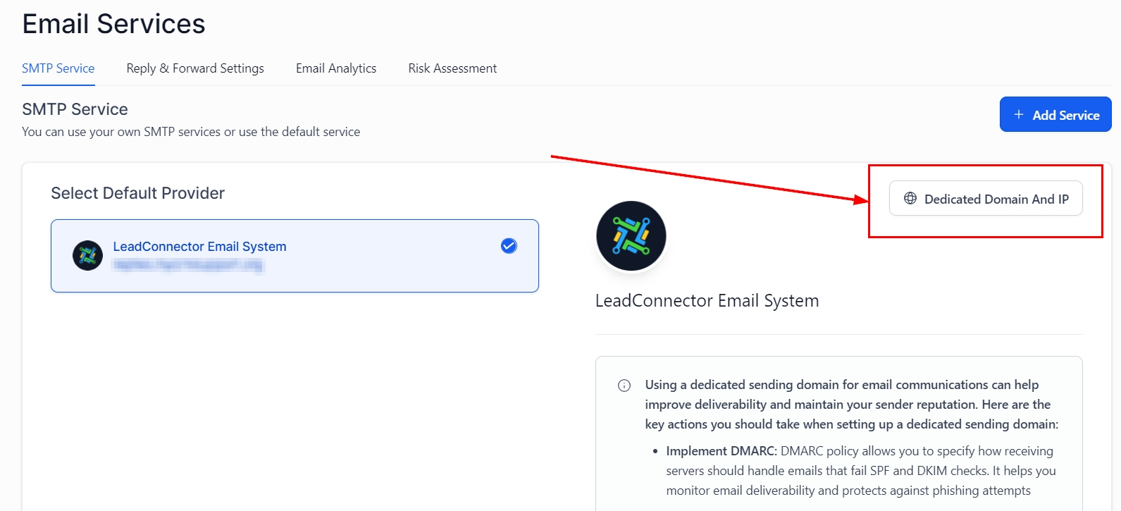 From the left navigation menu, select the "Email Services" tab, then click on "Dedicated Domain And IP" under the SMTP Services section.