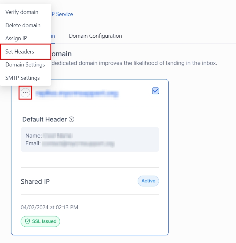 Find the dedicated domain you wish to configure and click on the three dots to access more options. Select "Set Headers" from the dropdown menu.