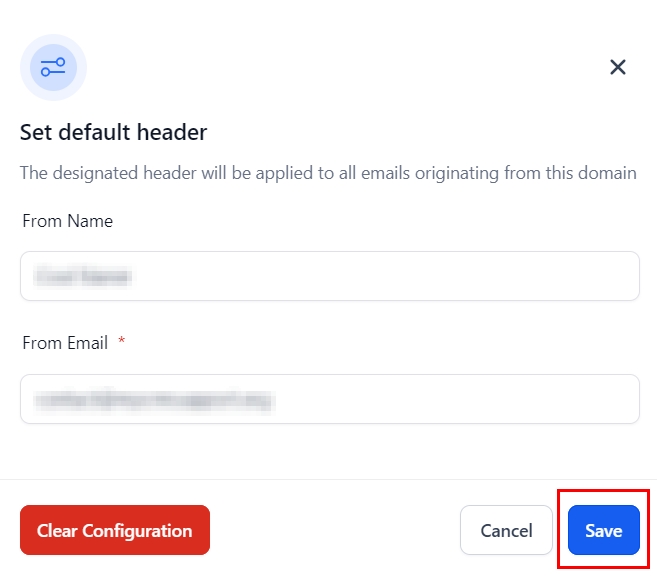 In the provided fields, enter the default from name and email address you wish to use for this domain. These will be applied to all outgoing emails sent through this domain.