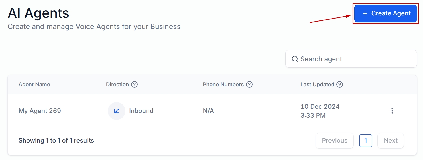 Navigate to the Voice AI Agents section inside your account settings and click + Create Agent.