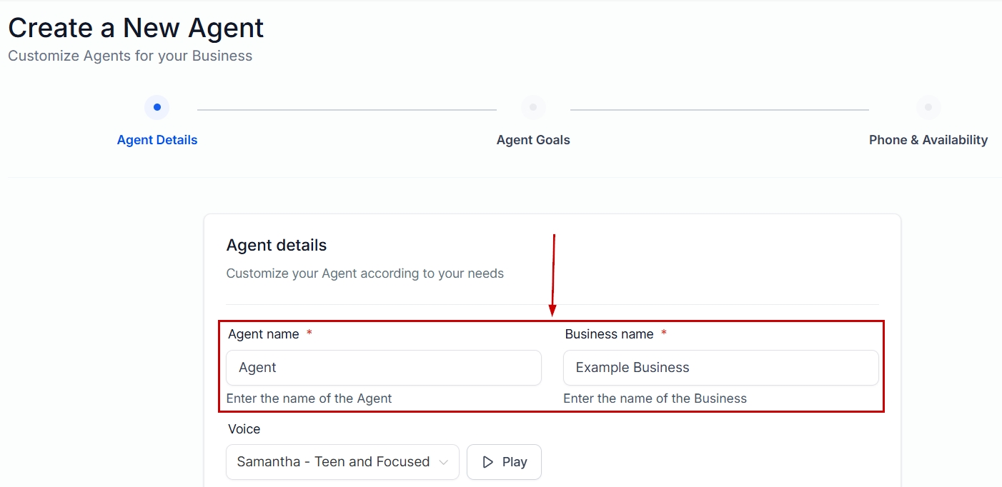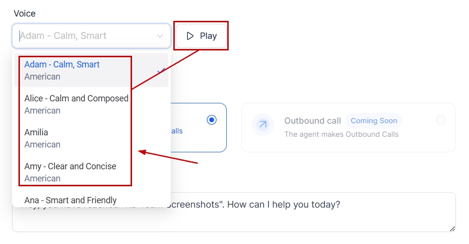 Open the drop-down menu to select a voice for your agent. All voices will have an underline pointing to the kind of accent they will have, and by clicking the Play button you can hear a preview of the agent's voice.