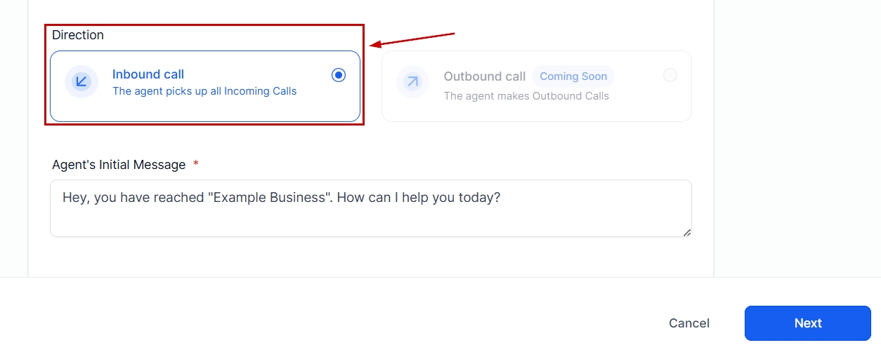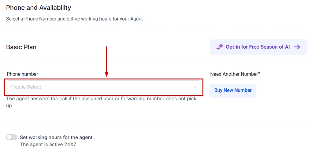 If you don't have one or want an exclusive line for the AI you can click Buy New Number which will redirect you to the Phone Numbers section to complete the purchase. The progress you've made on the AI Agent will be saved automatically.