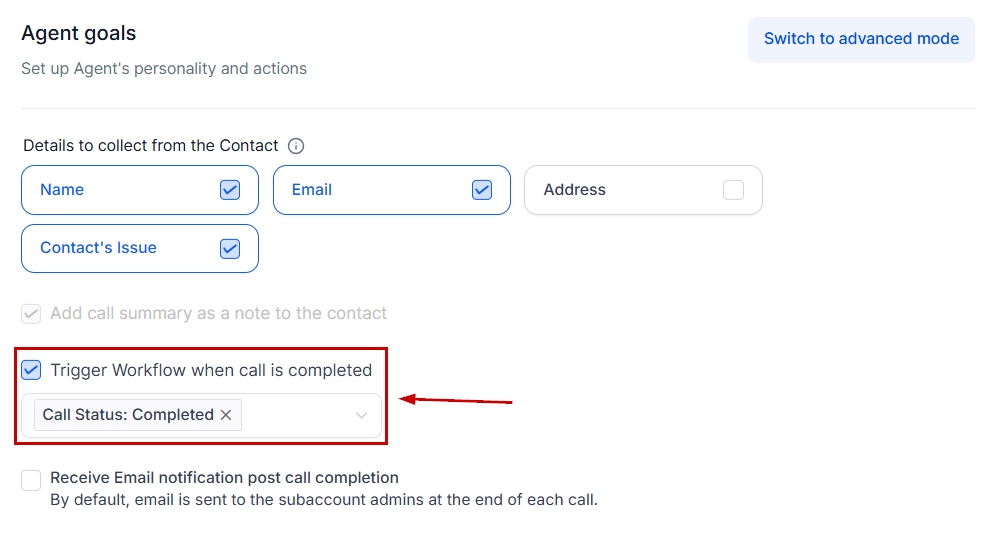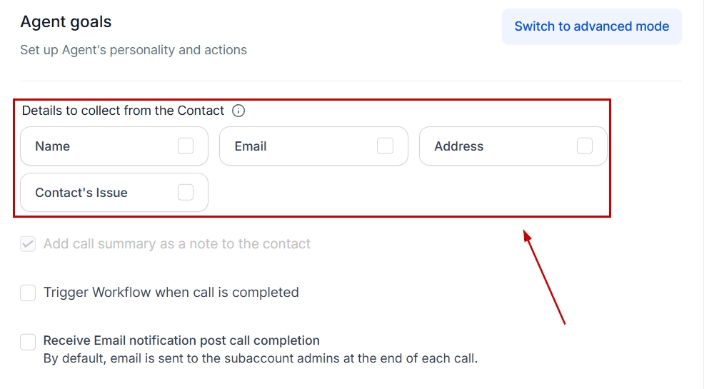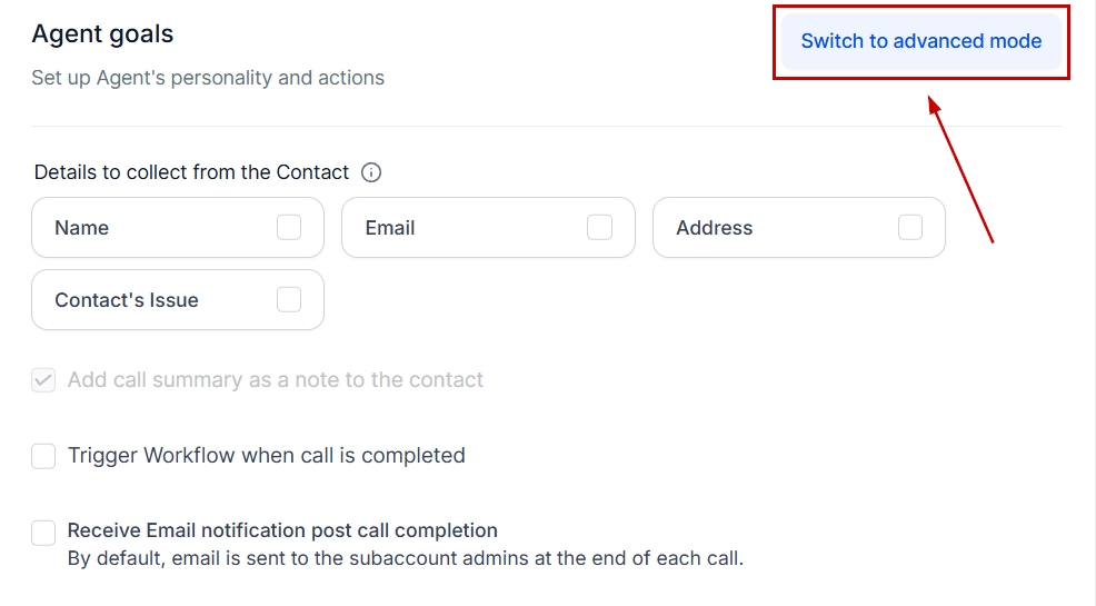 📌Note: Once an agent is created with the Advanced Goals, it cannot be switched back to Basic