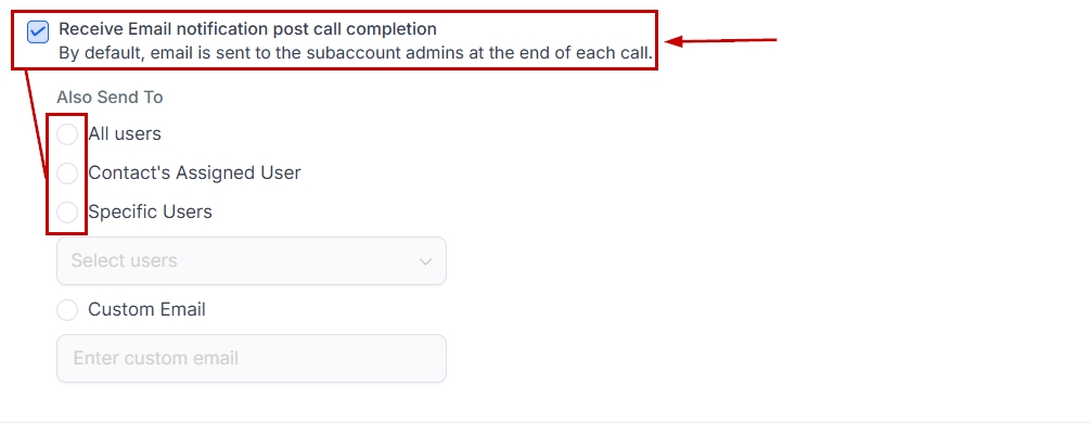 By default, all subaccount admins get notified but to notify additional users check “Receive Email notification”. Select the users or additional email addresses by clicking the circle next to them and picking them from the drop-down menu if needed.