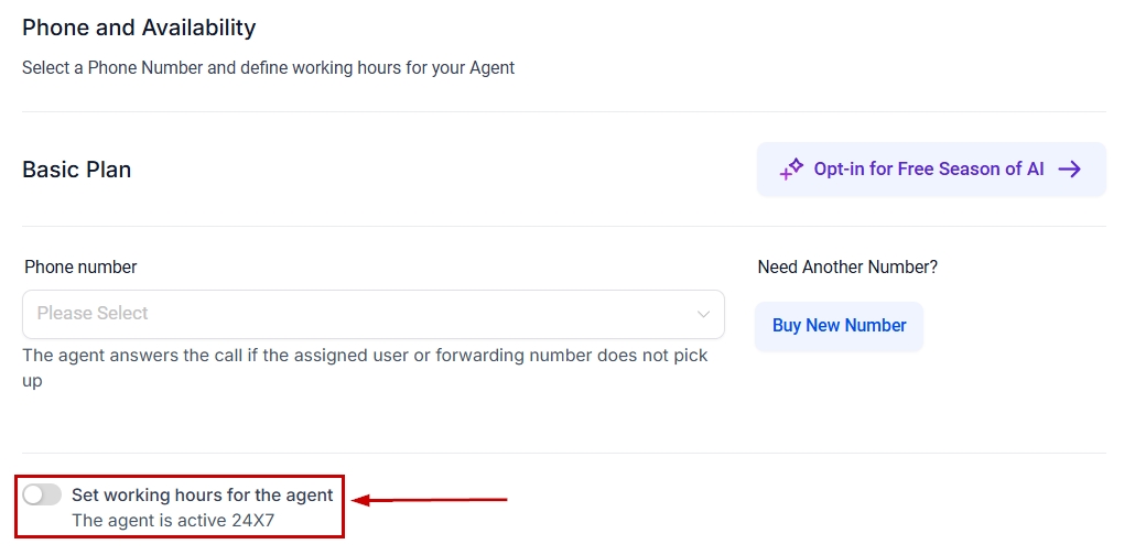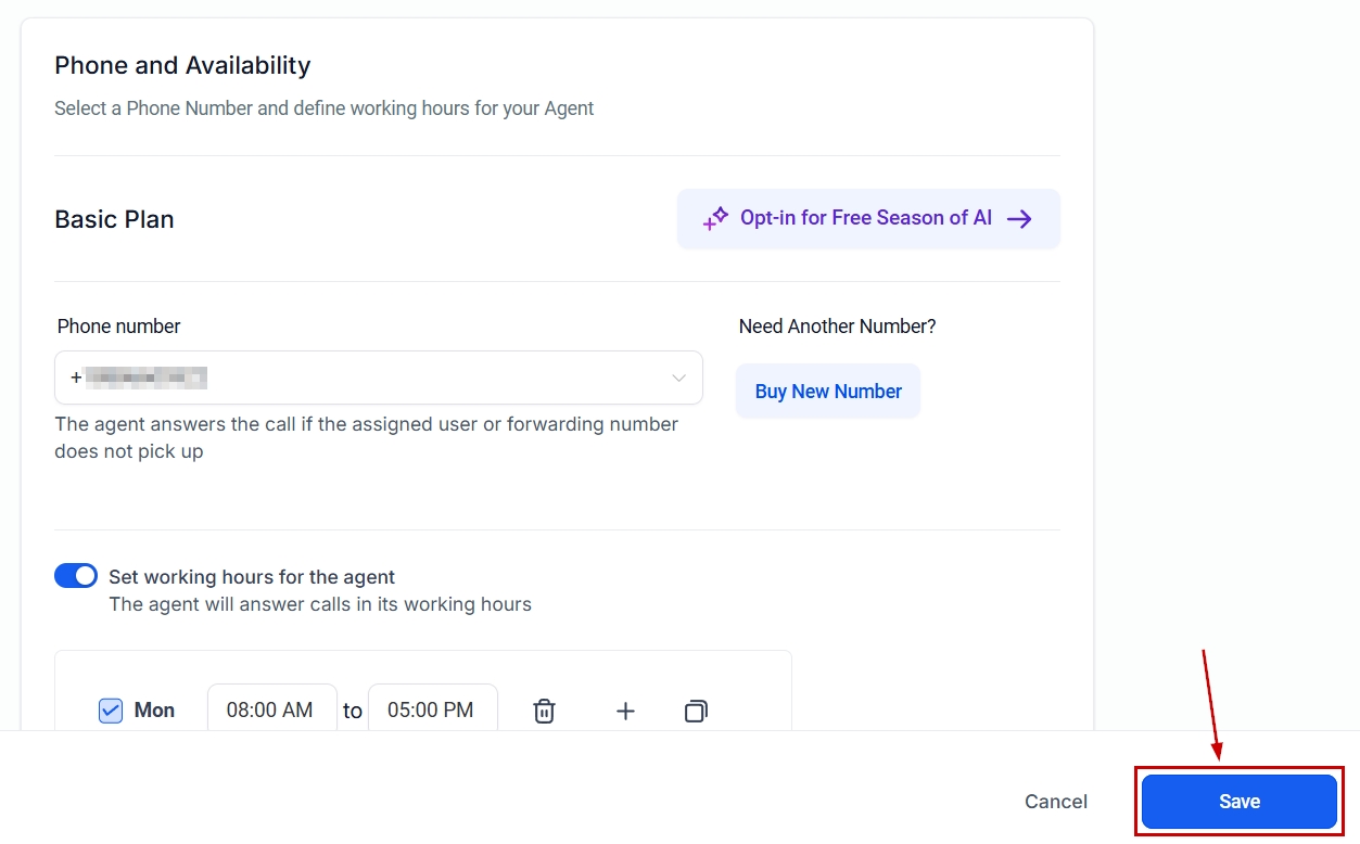 By default, the agent will answer phone calls 24/7. However, if you want to limit this toggle “Set working hours” which will allow you to select the days and times it will answer the phone.